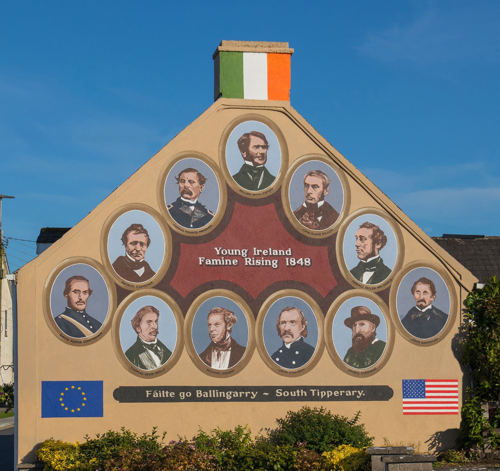 The mural commemorates the Young Ireland movement whose Famine Rising of 1848 took place in Ballingarry. The Young Irelanders were a brilliant group of cultural nationalists who were goaded into a Rising by the British government’s disastrous handling of the Famine. They believed in national self-determination and that an Irish government would save lives in the Famine. They were also influenced by the great initial success of the 1848 Revolutions across the European continent.