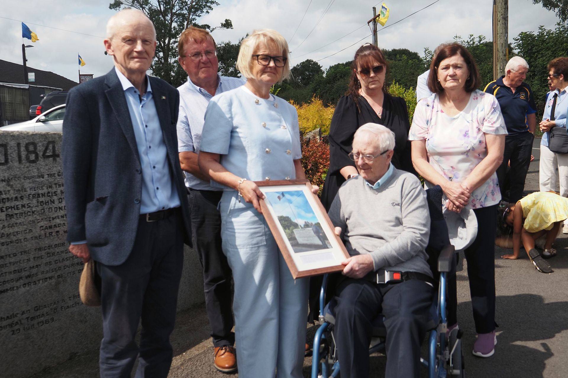 Senator Imelda Goldsboro makes a presentation to John Webster at the National Flag monument in The Commons. Also in the picture, John's wife Mary Webster, daughter Elaine Webster, Dr Thomas Mc Grath and Martin Maher of the